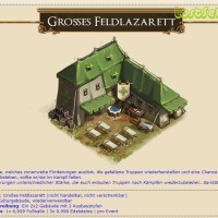 lazaret.png Stellt 1 Medizinkoffer in 14 Tagen her, Produktionsgeschwindigkeit wird pro Lazarett um +50% erhöht. Grundproduktionszeit beträgt 14 Tage.