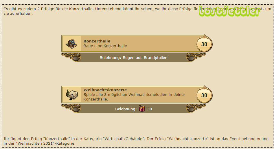 Es gibt zwei neue Erfolge die Konzerthalle betreffend. Man soll eine Konzerthalle bauen. Wer schon eine hat und nicht vor hat sich beim Kaufmann eine zweite zu holen, kann vor Event-Beginn seine Konzerthalle abreißen. Keine Angst diese landet im Stern ;-) Man kann dann nach Event-Start diese aufbauen und die entsprechenden Weihnachtsmelodien starten.
