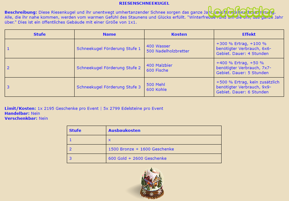 Riesenschneekugel, Eispalast, Iglu, Spielzeugfabrik – es gibt einiges an „nicht handelbaren“ und durchaus interessanten bzw. netten Gebäuden zu holen. Außerdem gibt es 3 ganz neue (und meiner Meinung nach sehr schicke) Gebäude – ein neues Wohnhaus, ein neues Lager und ein Gebäude, das „Zonenbuffs“ erzeugen wird.