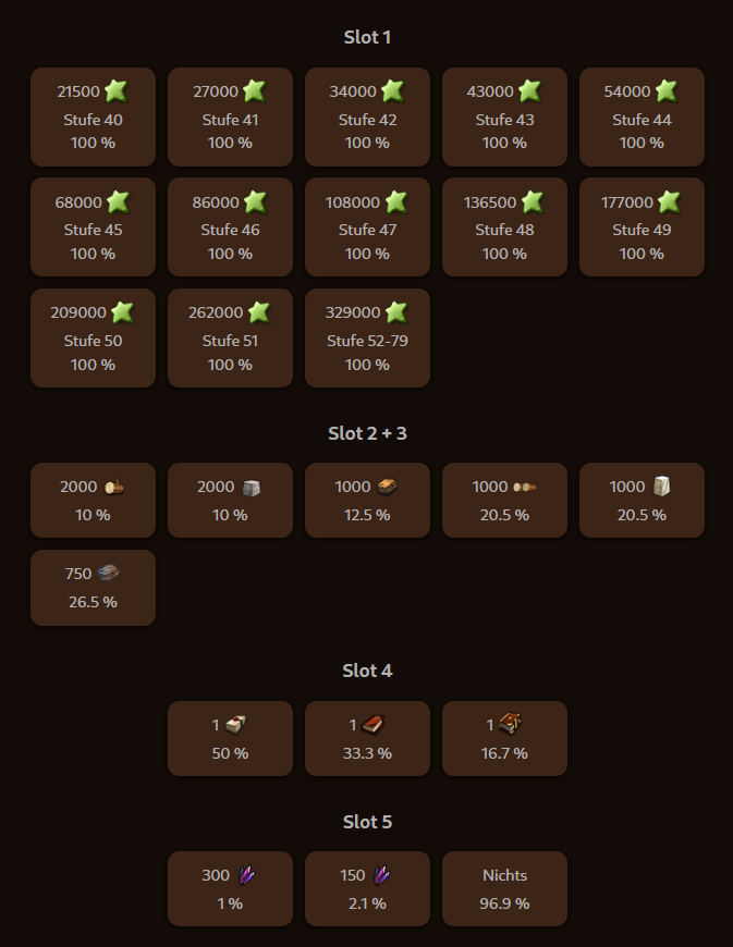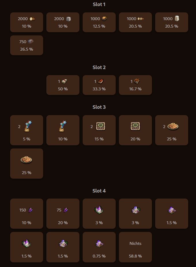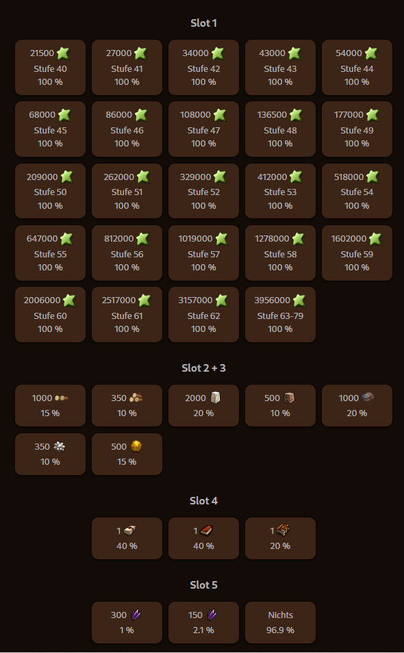 | Benötigt (Sammelt / Produziert) | Wo |