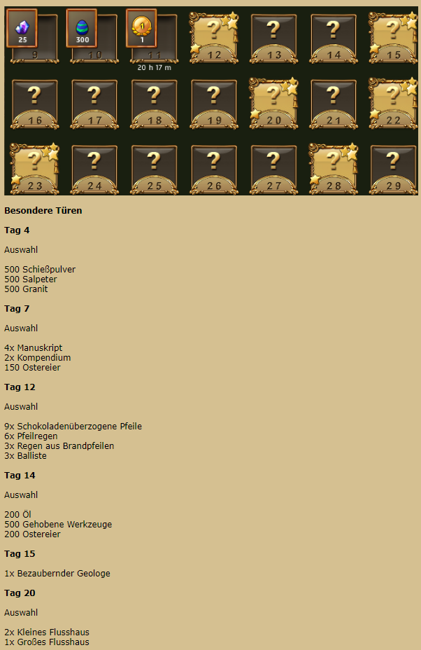 Untenstehend findet ihr die diesjährige Auswahl an Saisonalen Abenteuern für dieses Event. Die Rohstoffe und Erfahrungspunkte in der Belohnung für diese Abenteuer werden verdoppelt. Dies gilt nur für Rohstoffe, Auffüller und Erfahrungspunkte, nicht für Förderungen und Gebäude.